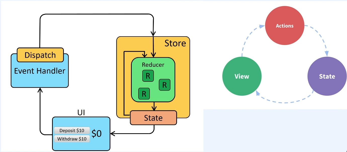 - react는 dispatch(action) 를 실행하면 store를 통해 Reducer를 실행하게 되는데 이전 state를 가지고 새로 갱신될 상태를 reducer를 통해 가공해 받은 다음 새로운 State 를 UI에 보여준다.